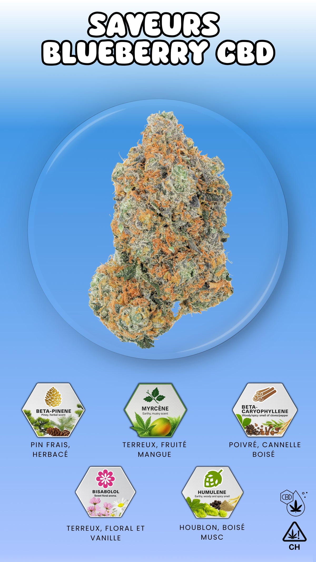 Un mélange parfaitement équilibré, qui donne à la Blueberry son caractère fruité, mais aussi son impact relaxant, recherché par les connaisseurs elle était recréer avec un taux de THC < 1% par des spécialiste en Suisse.